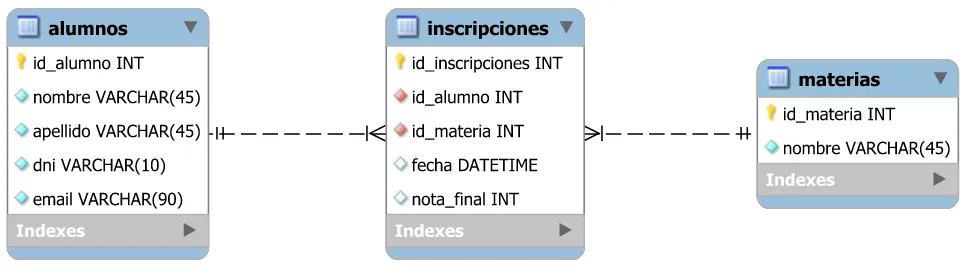 Por ejemplo, si tenemos una base de datos con las tablas: alumnos, materias e inscripciones, donde esta última es una tabla intermedia entre las otras dos, y en ella se almacena la fecha de inscripción y la calificación final del alumno.