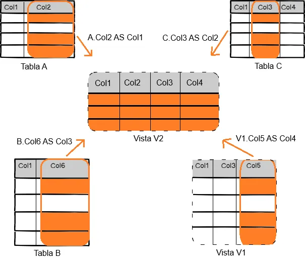 En la imagen, podemos ver que la Vista V2 selecciona registros de las tablas base Tabla A, Tabla B, Tabla C y de la Vista V1. Pero solo de los campos indicados y no necesariamente todos los registros. La limitación dependerá de las cláusulas incluidas en la consulta que conforma a la Vista V2.