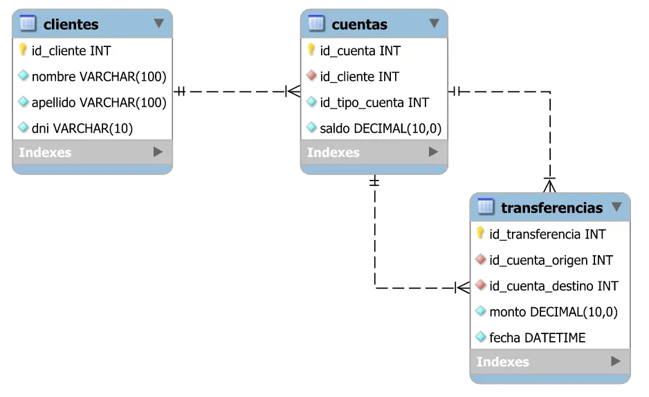 1INSERT INTO transferencias (id_cuenta_origen, id_cuenta_destino, monto, fecha)2VALUES (1246542576, 1945387487, 5000, CURDATE());Como vemos, cada paso de la transferencia es importante e indispensable para que no haya inconsistencias en los datos. Es decir, para que la transferencia de fondos sea considerada exitosa, todas las sentencias deben ejecutarse con éxito.