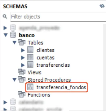 3CREATE PROCEDURE transferencia_fondos(4 IN origen INT,5 IN destino INT,6 IN monto DECIMAL,7 OUT id_transferencia INT8)9BEGIN10 START TRANSACTION;11