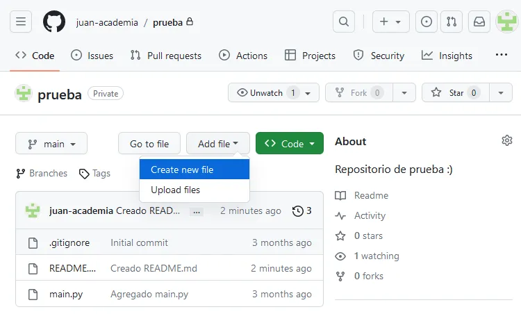 Si queremos crear otro archivo (distinto al README), debemos abrir el desplegable “Add file” y elegir la opción “Create new file”.