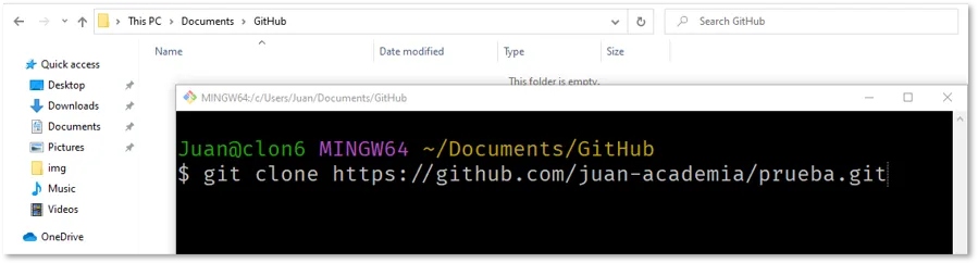 Para poder clonar el repositorio, Git crea la carpeta que lo contendrá e intentará conectarse con GitHub.
