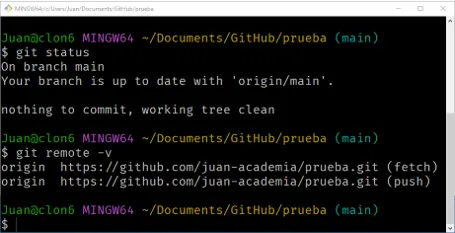 git status nos mostrará que estamos sincronizados con origin/main, el repositorio remoto.