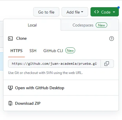 Al presionar el botón ”<> Code” veremos distintas opciones para descargar o clonar el repositorio.