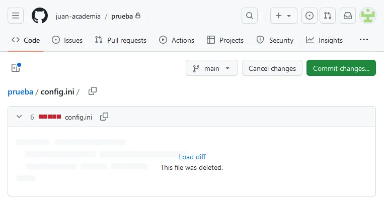 Esto nos mostrará el editor vacío, indicando que el archivo se borró. Igual que antes, debemos realizar un commit para que los cambios tengan efecto en el repositorio.