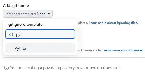 Para evitar que estos archivos se trackeen y se suban a nuestro repositorio remoto, podemos añadirlos en .gitignore para que Git los ignore. Si nuestro proyecto contendrá código Python, podemos elegir la plantilla Python en la lista desplegable, como punto de partida.