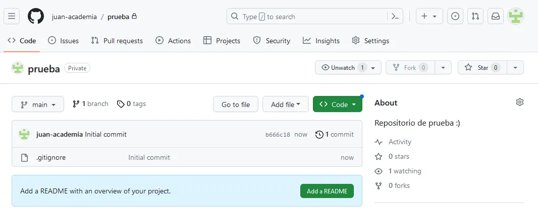 Finalmente, al crear el repositorio, GitHub nos redirigirá a la página principal del mismo. Como podemos ver, se ha agregado el archivo .gitignore y se ha realizado el commit inicial automáticamente.
