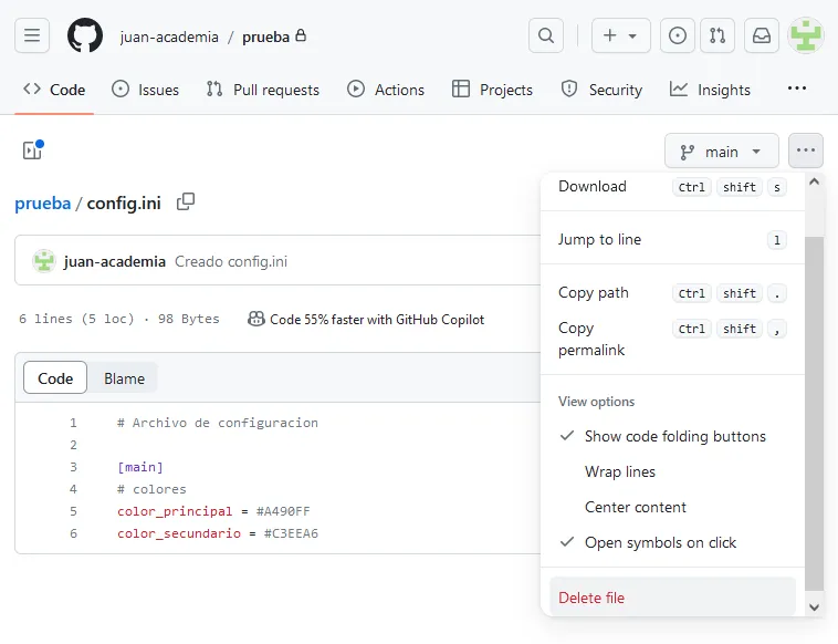 Ahora, para demostrar cómo se hace, eliminaremos el archivo recién creado. Para esto, en primer lugar, debemos acceder al archivo haciendo clic sobre su nombre. Estando en el archivo, debemos hacer clic en el botón con los tres puntos, y seleccionar la opción “Delete file”.