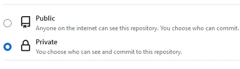 La siguiente sección nos solicita indicar si el repositorio será público (accesible sin permisos) o privado (sólo por invitación). Para este primer repositorio podemos crearlo privado para realizar pruebas.