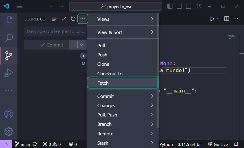 Por otro lado, si solo queremos realizar un fetch de los cambios (es decir, no realizar el merge que implica un pull), podemos hacer clic en los tres puntos en la sección de Source Control, y se desplegarán los comando que podemos realizar, entre ellos, fetch.