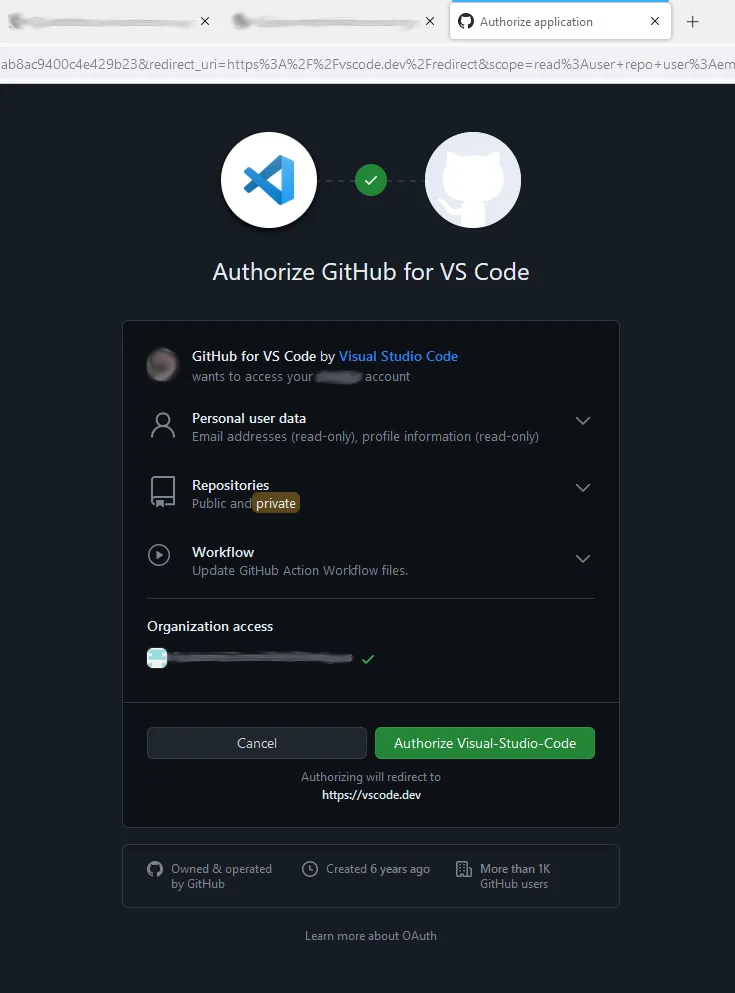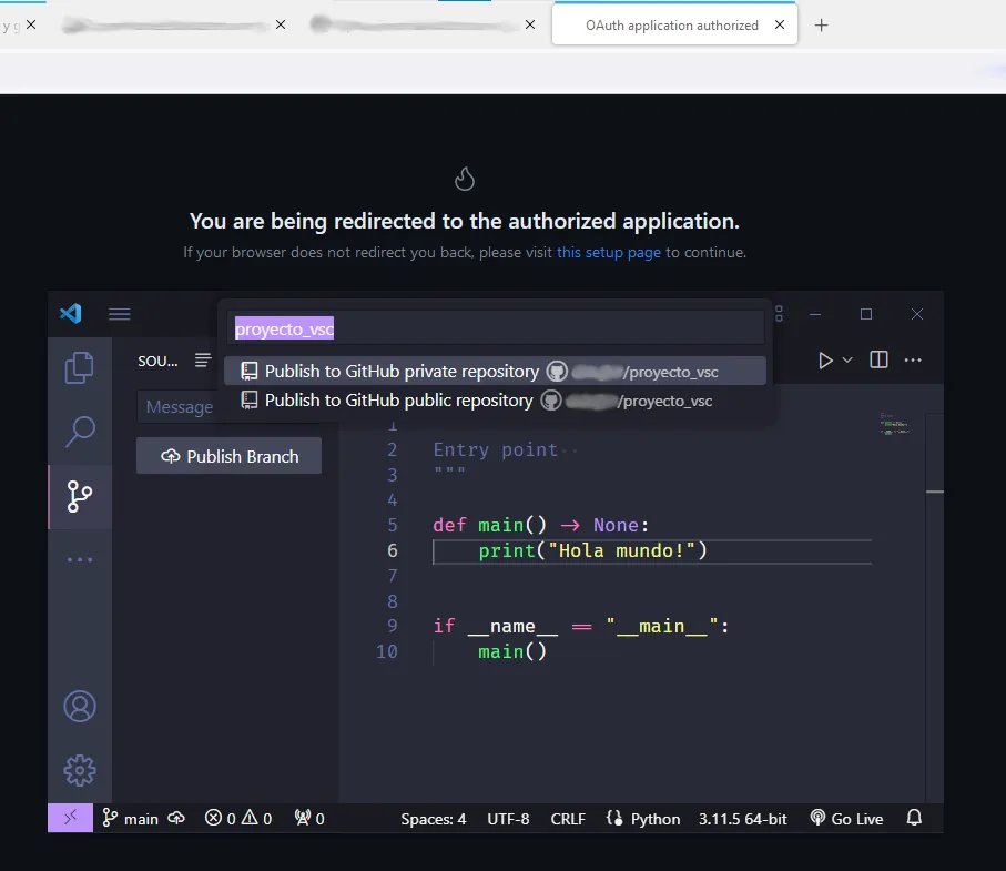 VS Code nos pedirá autenticarnos en nuestra cuenta de GitHub mediante el navegador predeterminado, para darle a VS Code los permisos para crear el nuevo repositorio en la nube.