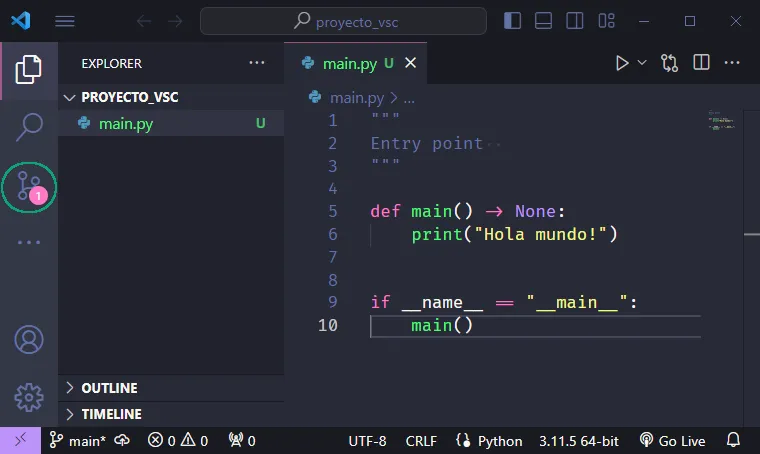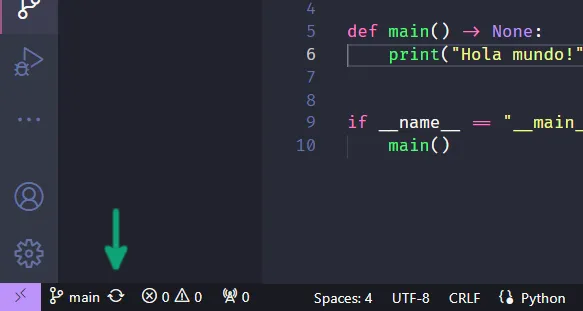 Además, en el lado izquierdo de la barra de estado, figurará el nombre de la branch en la que nos encontramos, en este caso, main.