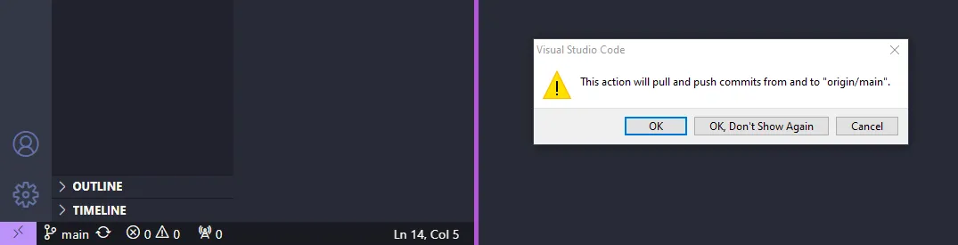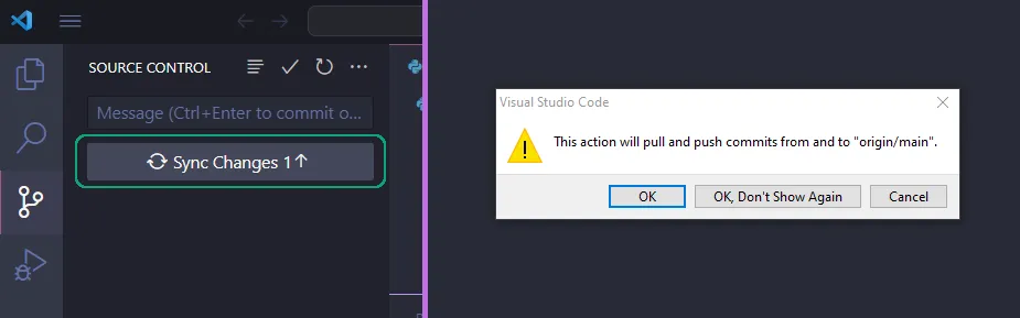 Esta acción nos advertirá que VS Code realizará, primero un pull y luego un push al repositorio remoto.