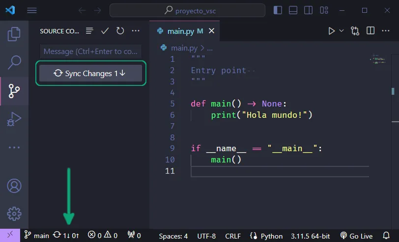 Si ya tenemos configurado un repositorio remoto, VS Code lo detectará y nos permitirá subir o bajar cambios en la branch actual.